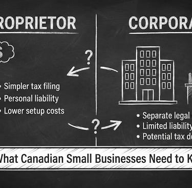 One of the first and most important decisions Canadian small business owners make is choosing a business structure. The two most common options are sole proprietorship and corporation—each with its own tax implications, legal responsibilities, and costs.